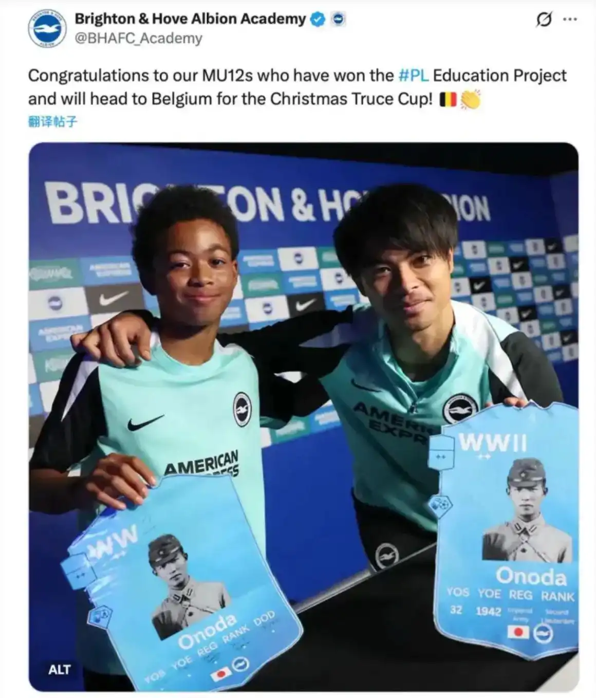 2天前,布莱顿俱乐部组织了纪念一战期间“圣诞节休战”的反战教育活动。活动中,每个人都会拿着一个卡片,卡片上印着的则是本国的“英雄”。让人震惊的是,三笘薰手中的卡片印着的竟然是一位日本战犯–小野田宽郎。