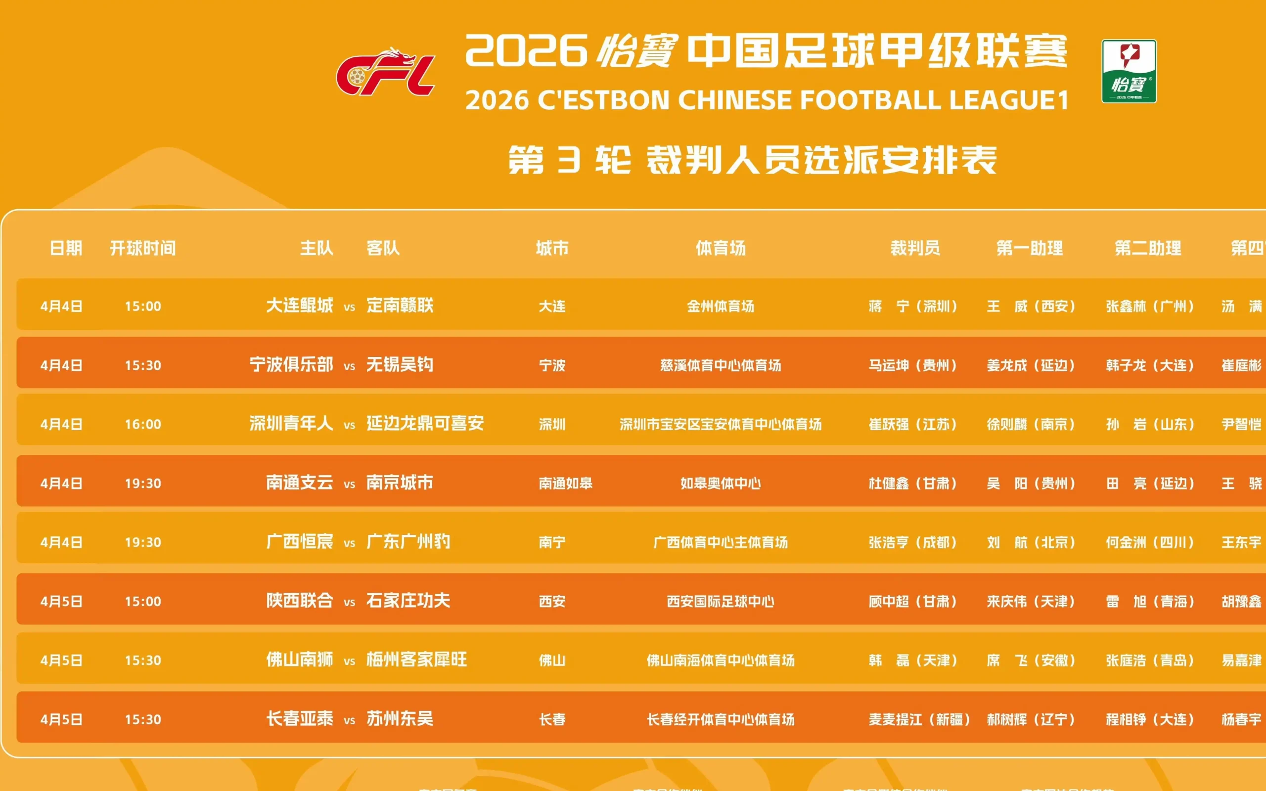 北京时间4月4日,中甲第3轮裁判名单公布,麦麦提江执法长春亚泰vs苏州东吴