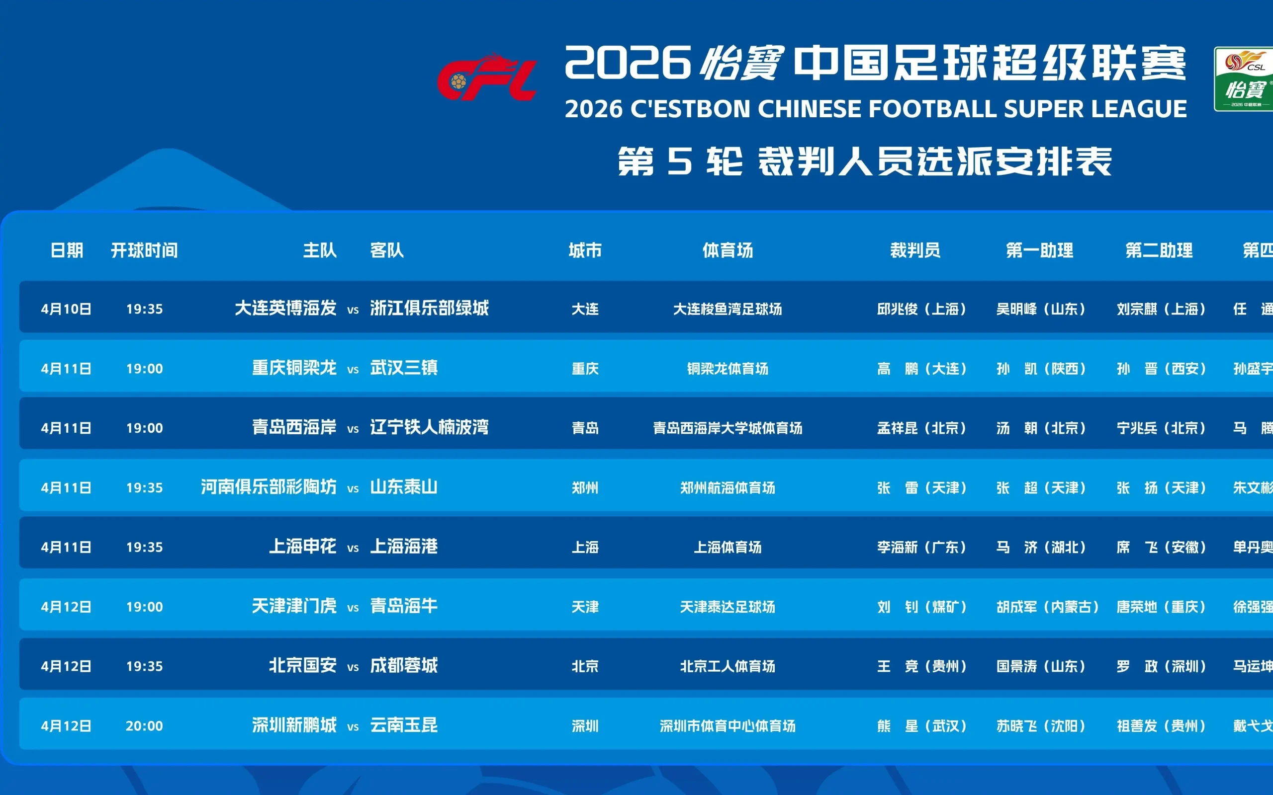 北京时间4月10日,中国足协公布了中超第五轮的裁判选派,其中邱兆俊、熊星两位裁判首次执法中超。