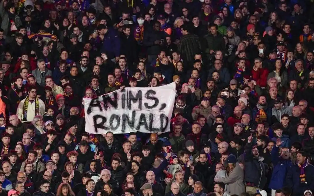 在诺坎普球场,球迷们在阿劳霍因个人原因决定暂时休息后的首场比赛中,表达了对他的支持。看台上出现了多条为这位乌拉圭中卫打气的横幅,显示出球迷们与他站在一起。