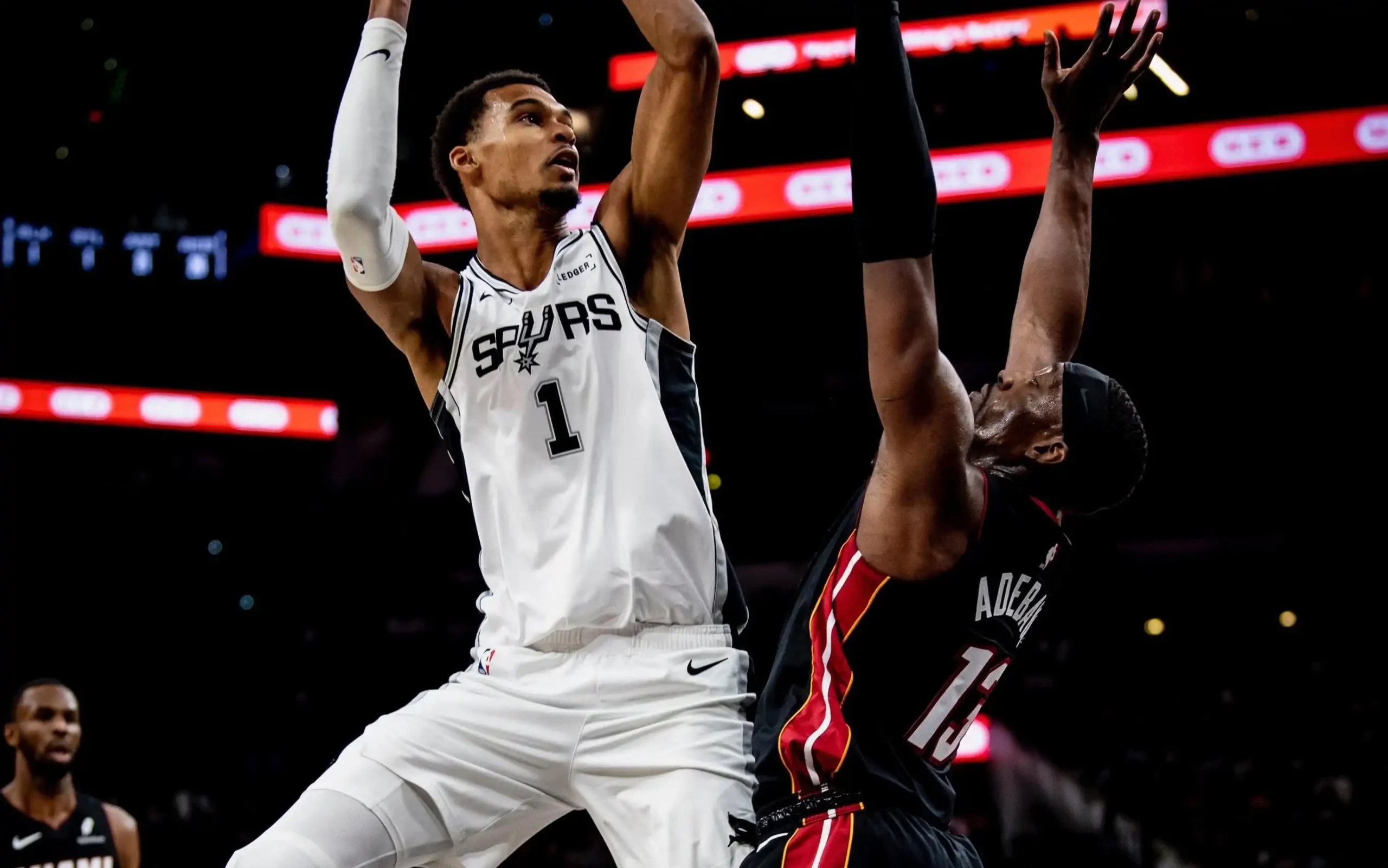 在比赛最后时刻,文班亚马展现了自己恐怖的统治力——他先是在防守端以近乎于摘帽的方式帽下了对方达维昂-米切尔的上篮,随后自己发动一条龙反击跑投打板命中,帮助马刺队锁定胜局。