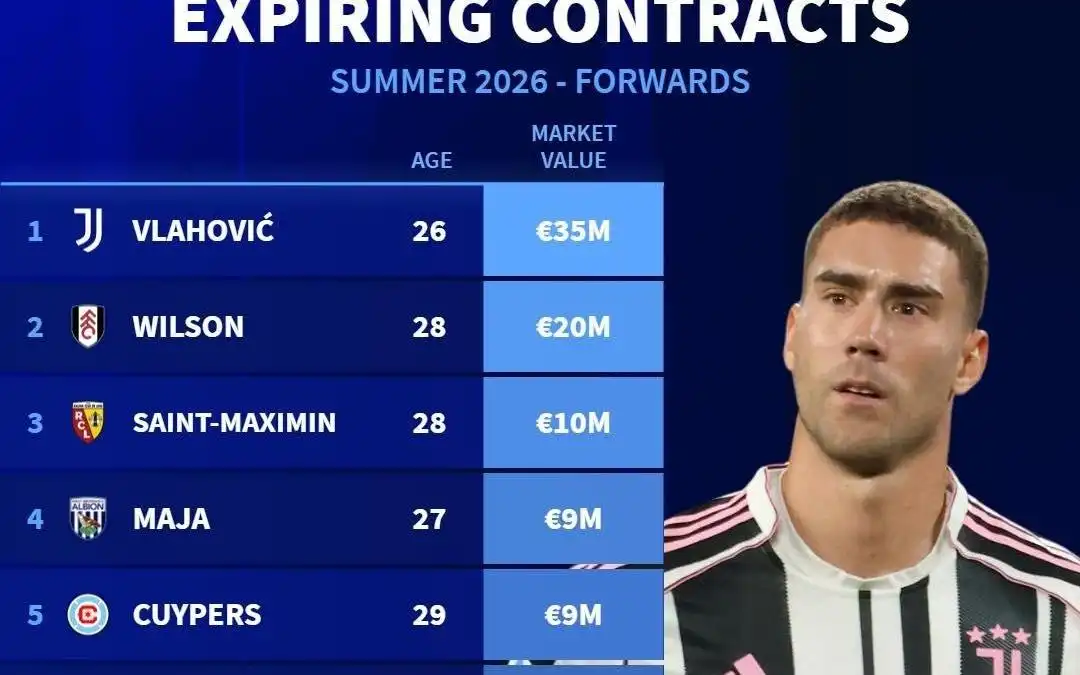 德国转会市场统计了今夏合同到期的十大前锋,其中球员按照身价从高到低排序。