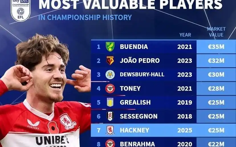 7. 哈克尼(米德尔斯堡)2500万欧元(2025年)