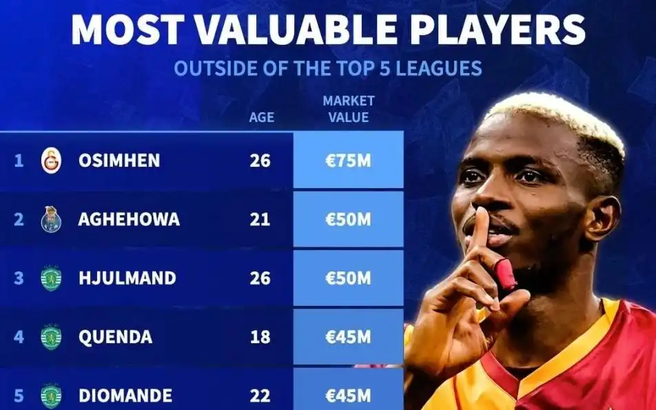 北京时间12月29日,德转列出了非欧洲五大联赛球员身价前10,奥斯梅恩以7500万欧元高居第一,奥莫罗迪翁和莫滕-尤尔曼德5000万欧元并列第二,巴塞罗那旧将维托尔-罗克上榜。