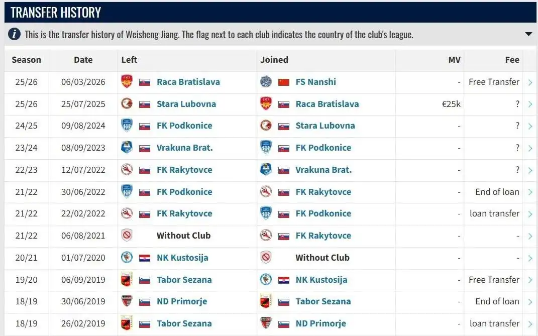 据德国转会市场信息,26岁留洋姜伟胜加盟佛山南狮,此前球员曾在斯洛伐克留洋多年。
