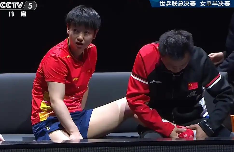 女单半决赛,孙颖莎从第二局开始频繁揉腿,并且移动受限,到了第三局结束后主动申请医疗暂停。队医对其左脚踝紧急缠绷带固定,但剧痛仍使她出现不受控的咬牙、面部扭曲和张嘴等表情。尽管移动能力严重下降,她仍以11-7赢下第四局,最终因伤势加剧,于第六局前宣布退赛。
