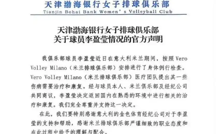 北京时间12月21日,天津女排官方发布声明,米兰排球俱乐部医疗团队提出李盈莹的一些伤病需要治疗和康复,李盈莹决定返回国内在熟悉的环境中进行相关的治疗和康复。