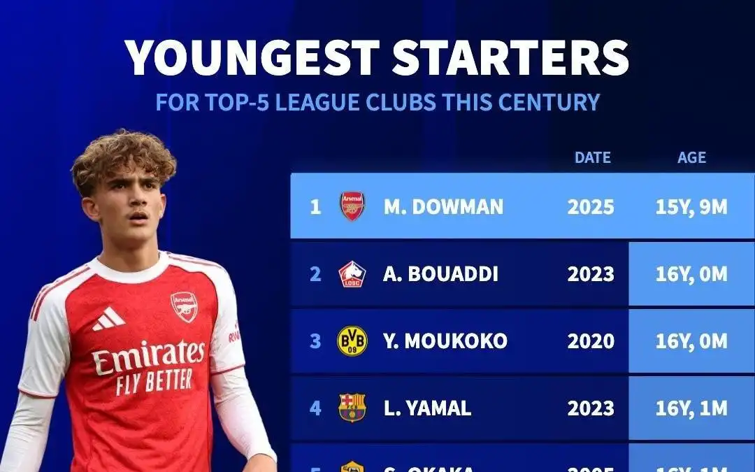 本世纪五大联赛最年轻首发前十:道曼第一,亚马尔第四