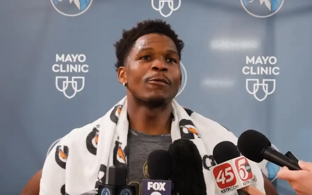 北京时间4月16日,在NBA季后赛对阵掘金赛前,森林狼球员爱德华兹接受了媒体的采访。