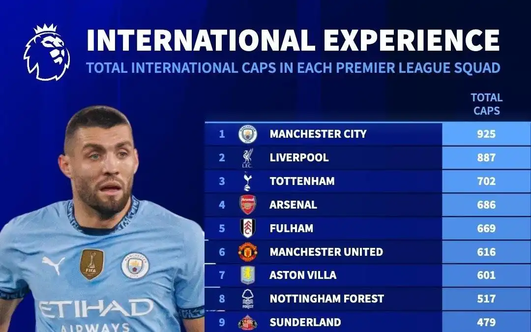 北京时间10月31日,德转统计出了本赛季至今英超20家俱乐部球员国家队出场数的排行榜,曼城以合计925场高居第一,利物浦887场排名第二,托特纳姆热刺702场第三,相对年轻的切尔西则以338场排名第18位。