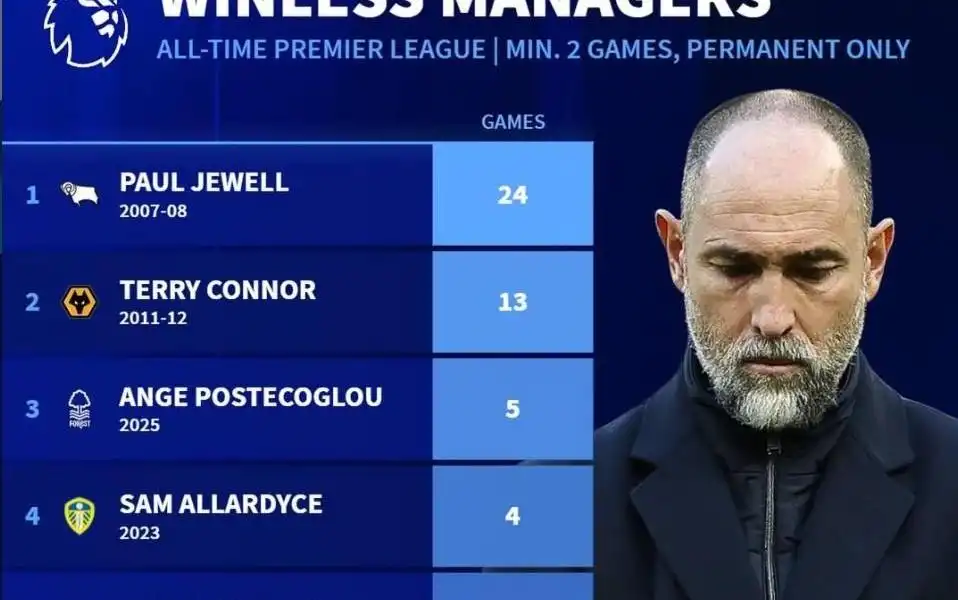 英超历史新帅最长开局不胜(正式主帅且至少执教2场):