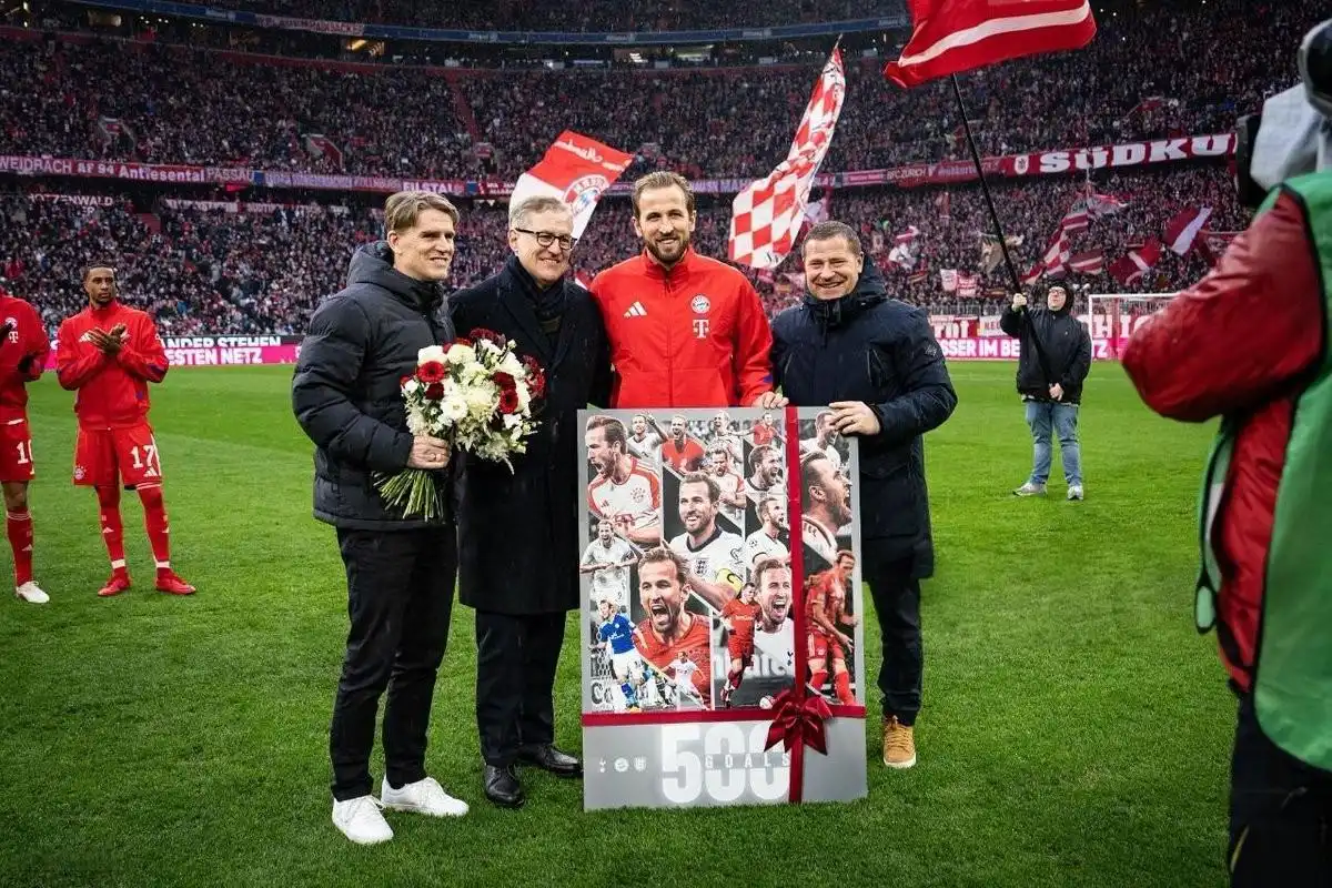德甲第23轮,拜仁慕尼黑主场对阵法兰克福,赛前,上一场比赛达成职业生涯500球里程碑的凯恩获得了俱乐部赠送的纪念礼物。