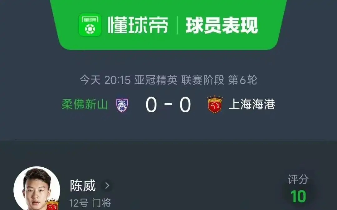 12月9日晚上,亚冠精英联赛,上海海港客场0-0逼平了柔佛新山,海港门将陈威在这场比赛有超神表现。