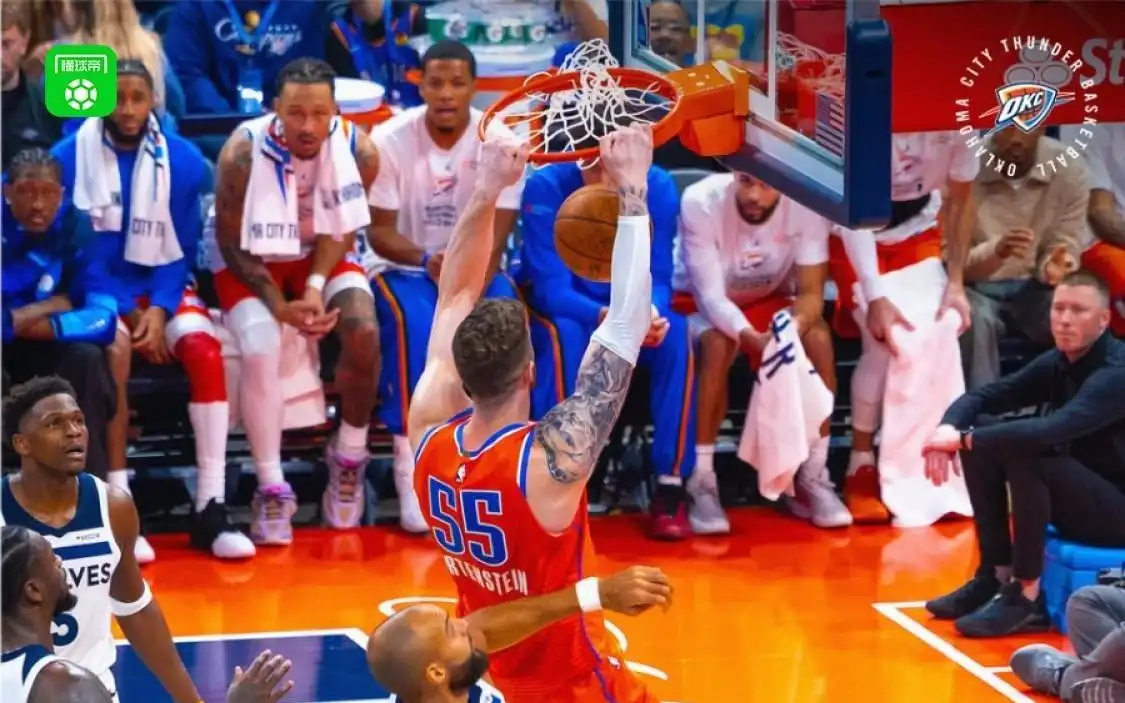 第一节雷霆哈尔滕施泰因拿下6分,森林狼麦克丹尼尔斯拿下8分,首节战罢雷霆24-17领先森林狼