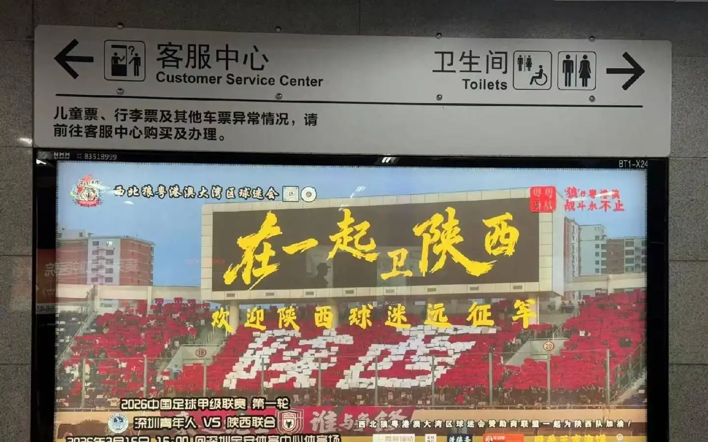 2026赛季中甲联赛第一轮,深圳青年人将于3月15日16点在深圳宝安体育中心体育场对阵陕西联合。赛前,陕西球迷在深圳地铁投放广告,为陕西联合加油。