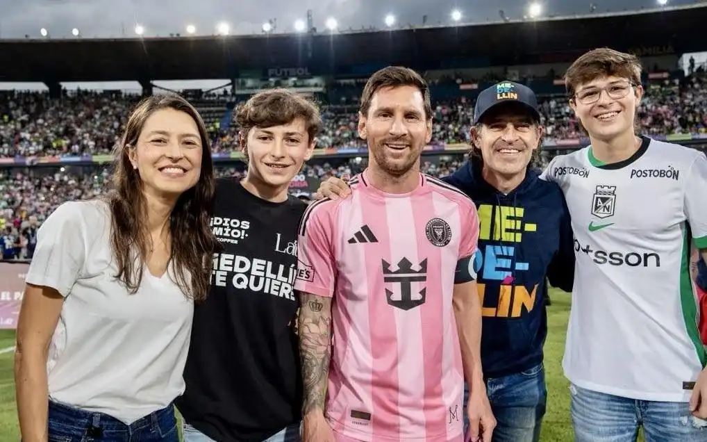 在迈阿密国际与国民竞技的比赛结束后,哥伦比亚麦德林市长Federico Gutiérrez在社交媒体上分享了全家与梅西的合影。