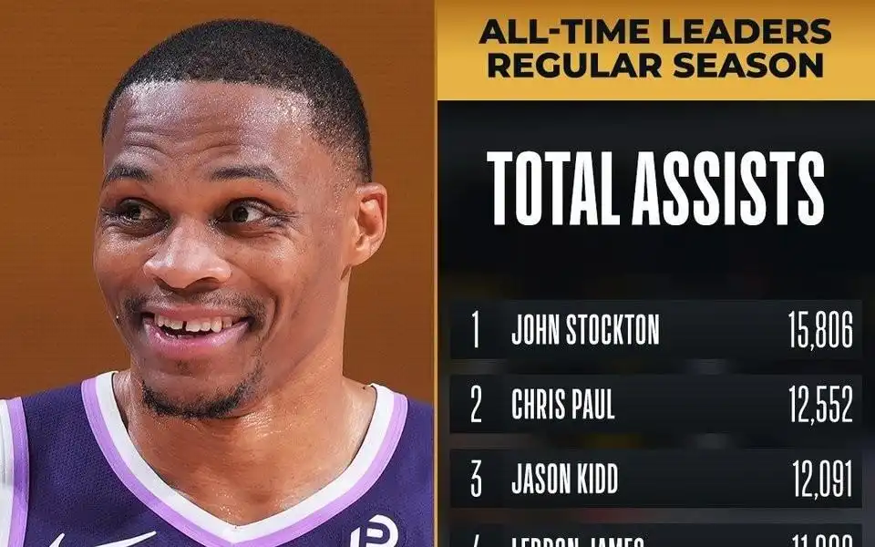 根据NBA官方的统计,现年37岁的威斯布鲁克生涯至今共计送出10336次助攻,他也就此超越了纳什(10335次),成为NBA历史助攻次数第5多的球员。