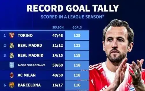 五大联赛单赛季联赛进球榜:巴萨5度上榜,拜仁109球暂列第12