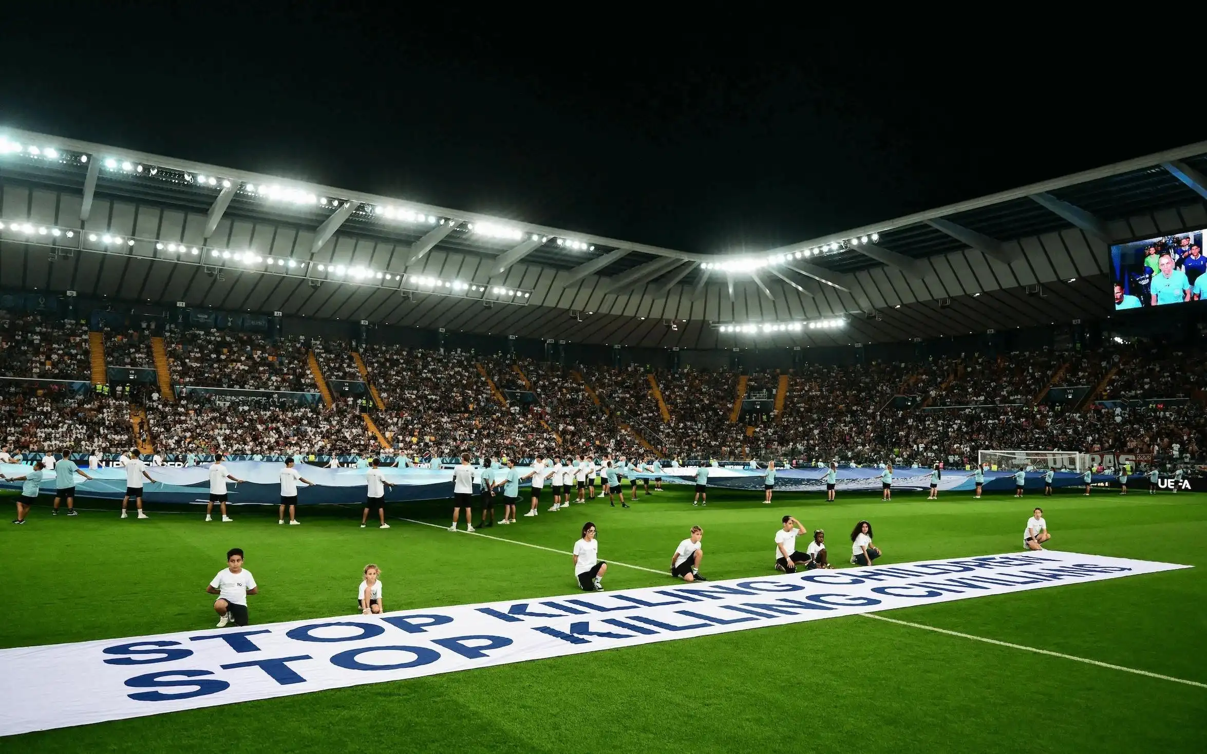 欧足联主席亚历山大-切费林对加沙的苦难深表同情,据知情人士透露,他个人推动在超级杯决赛上展示一条欧足联横幅,上面写着:“停止杀害儿童;停止杀害平民”。两名加沙难民儿童也参与了颁奖仪式。切费林还探讨了与前联合国巴勒斯坦领土特别报告员、同时也是“比赛结束以色列”运动的关键顾问理查德-福尔克会面的可能性。